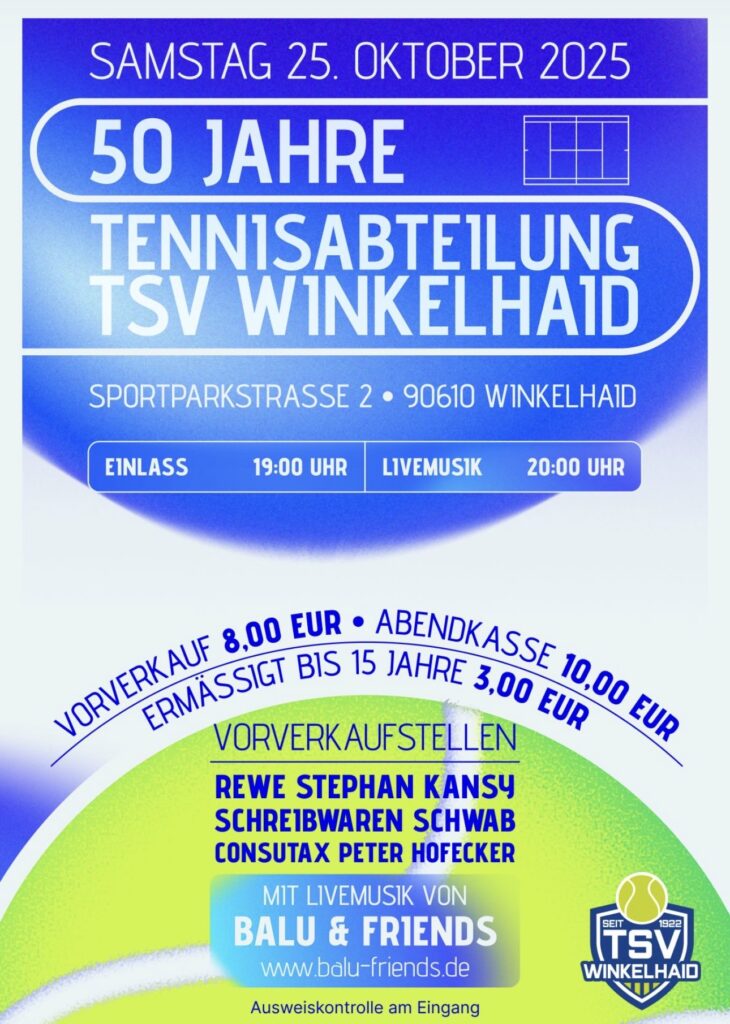 Am 25.10.2025 um19 Uhr steigt unsere große Jubiläumsparty zum 50-Jährigen Bestehen! 🎾